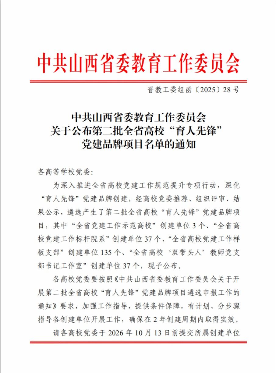 近日,省委教育工委公布全省第二批高校“育人先锋”党建品牌项目,我校 5 个项目入选,我系教师党支部成功入选全省高校“双带头人”教师党支部书记工作室创建单位。全省“育人先锋”党建品牌项目评选,旨在推动高校党建工作高质量发展,经基层申报、专家评审、集中公示等环节,全省 212 个项目入选。我系教师党支部在党建与教学、科研融合方面成效显著。此次入选,是对我系党建工作的高度认可。我系将以此为契机,严格按照建设要求,加强支部建设,发挥“双带头人”引领作用,为学校发展和人才培养贡献力量。