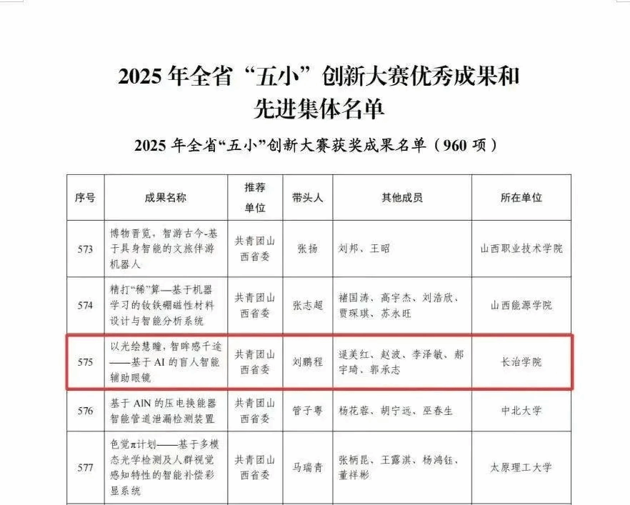 近日,山西省总工会、共青团山西省委与山西省科学技术协会联合发布《关于2025年全省“五小”创新大赛评审结果的通报》(晋工发〔2025〕28号)。物理系参赛作品《以光绘慧瞳,智眸感千途——基于AI的盲人智能辅助眼镜》凭借着过硬的技术、大胆的创新和重要的社会价值,成功荣获2025年全省“五小”创新大赛优秀成果三等奖,实现了在该赛事“从无到有”的新突破。