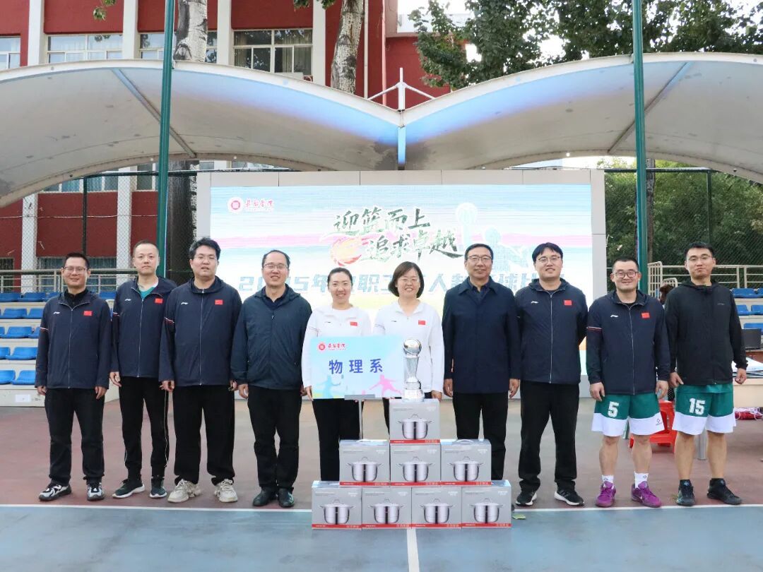 在刚刚落幕的长治学院2025年教职工“三人制”篮球赛中,物理系教工篮球队经过激烈角逐,最终斩获第三名的优异成绩。此次比赛是物理系教师风采的一次完美亮相,他们用行动生动诠释了“健康长院”的积极理念,证明了在教书育人和学术科研之外,他们同样拥有多彩的人生和强健的体魄。
